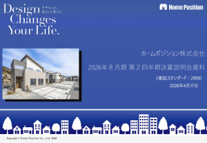 基本情報 会社コード: 29990 会社名: ホームポジション タイトル: 2026年8月期 第2四半期決算説明会資料 発表日時: 2026年04月20日 15:30 PDF URL: https://www.relea […]