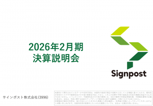 基本情報 会社コード: 39960 会社名: サインポスト タイトル: 2026年2月期 決算説明資料 発表日時: 2026年04月20日 15:30 PDF URL: https://www.release.tdnet […]
