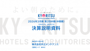 基本情報 会社コード: 96160 会社名: 共立メンテ タイトル: 2026年3月期第2四半期 決算説明資料 発表日時: 2025年11月21日 08:45 PDF URL: https://www.release.t […]