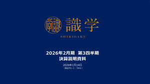 基本情報 会社コード: 70490 会社名: G-識学 タイトル: 2026年2月期第3四半期決算説明資料 発表日時: 2026年01月14日 15:30 PDF URL: https://www.release.tdn […]