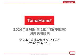 基本情報 会社コード: 14190 会社名: タマホーム タイトル: 2026年5月期第2四半期(中間期)決算説明資料 発表日時: 2026年01月13日 15:30 PDF URL: https://www.relea […]