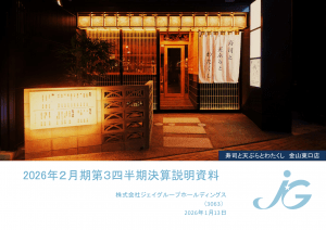 基本情報 会社コード: 30630 会社名: G-jGroup タイトル: 2026年2月期第3四半期決算説明資料 発表日時: 2026年01月13日 15:30 PDF URL: https://www.release […]