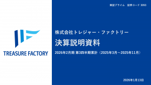 基本情報 会社コード: 30930 会社名: トレファク タイトル: 2026年2月期 第3四半期決算説明資料 発表日時: 2026年01月13日 15:30 PDF URL: https://www.release.t […]