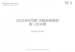 基本情報 会社コード: 29010 会社名: ウェルディッシュ タイトル: 2026年8月期 決算説明資料 第1四半期 発表日時: 2026年01月14日 18:00 PDF URL: https://www.relea […]