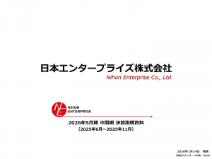 基本情報 会社コード: 48290 会社名: 日本エンタープライズ タイトル: 2026年5月期 中間期 決算説明資料 発表日時: 2026年01月14日 16:00 PDF URL: https://www.relea […]