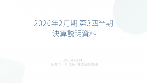 基本情報 会社コード: 93260 会社名: G-関通 タイトル: 2026年2月期 第3四半期 決算説明資料 発表日時: 2026年01月14日 17:45 PDF URL: https://www.release.t […]