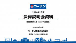 基本情報 会社コード: 75160 会社名: コーナン商 タイトル: 2026年2月期 決算説明会資料 発表日時: 2026年04月13日 15:30 PDF URL: https://www.release.tdnet […]