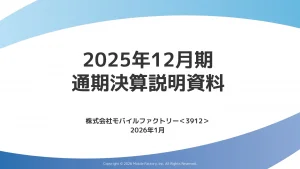 基本情報 会社コード: 39120 会社名: モバファク タイトル: 2025年12月期 通期決算説明資料 発表日時: 2026年01月29日 13:00 PDF URL: https://www.release.tdn […]