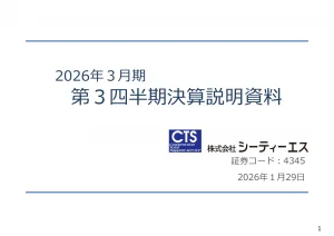 基本情報 会社コード: 43450 会社名: シーティーエス タイトル: 2026年3月期 第3四半期決算説明資料 発表日時: 2026年01月29日 13:00 PDF URL: https://www.release […]