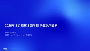 基本情報 会社コード: 87930 会社名: NECキャピ タイトル: 2026年3月期第3四半期決算説明資料 発表日時: 2026年01月29日 15:30 PDF URL: https://www.release.t […]