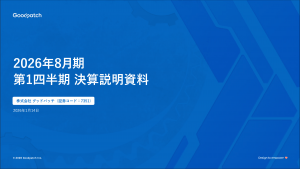 基本情報 会社コード: 73510 会社名: G-グッドパッチ タイトル: 2026年8月期 第1四半期決算説明資料 発表日時: 2026年01月14日 15:30 PDF URL: https://www.releas […]