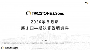 基本情報 会社コード: 73520 会社名: G-TWOSTONE タイトル: 2026年8月期 第1四半期決算説明資料 発表日時: 2026年01月14日 15:30 PDF URL: https://www.rele […]
