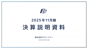 基本情報 会社コード: 73880 会社名: FPパートナー タイトル: 2025年11月期決算説明資料 発表日時: 2026年01月14日 15:30 PDF URL: https://www.release.tdne […]